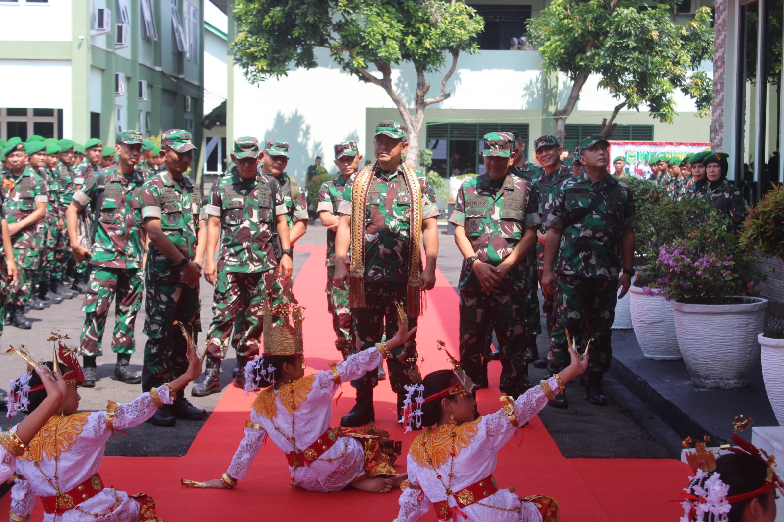 Kepala Staf Angkatan Darat (KASAD) Jenderal TNI Maruli Simanjuntak, M.Sc., tiba di Makorem 043/Gatam Jl. Teuku Umar Penengahan Bandar Lampung, langsung disambut dengan laporan dari Danrem 043/Gatam Brigjen TNI Rikas Hidayatullah, S.E., M.M., pengalungan selendang tapis oleh Siswa SD Yayasan Kartika Jaya, jajar kehormatan oleh anggota jaga Kesatriaan, penampilan Drumband SD Yayasan Kartika Jaya dan tarian Siger Pengunten yang menjadi ciri khas Provinsi Lampung. Rabu (5/6/2024).