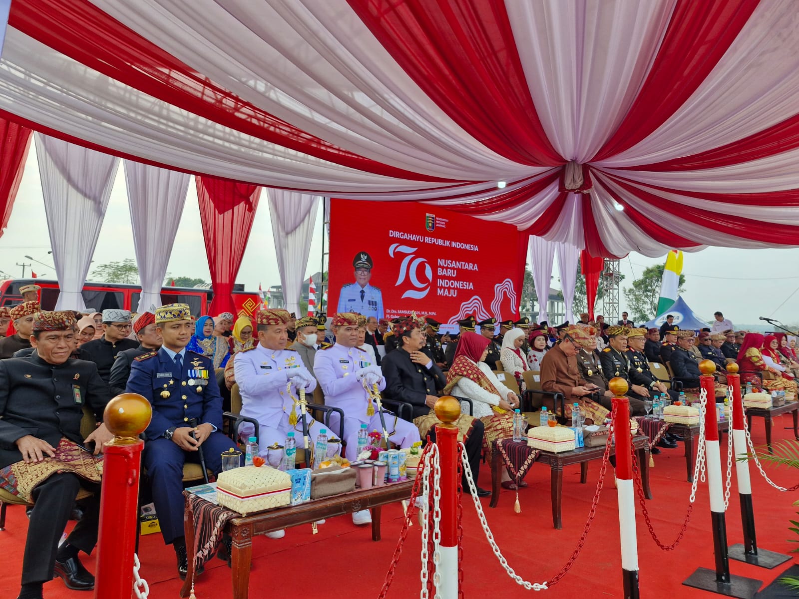 Upacara peringatan HUT RI ke-79 yang bertema “Nusantara Baru Indonesia Maju”. Pelaksanaan upacara pengibaran bendera HUT RI ke-79 dipimpin langsung oleh Pj. Gubernur Lampung Dr. Drs. Samsudin, S.H., M.H., M.Pd. sebagai inspektur upacara, dihadiri oleh jajaran Forkopimda serta pasukan upacara yang terdiri dari TNI Polri beserta PNS dan organisasi masyarakat Lampung.