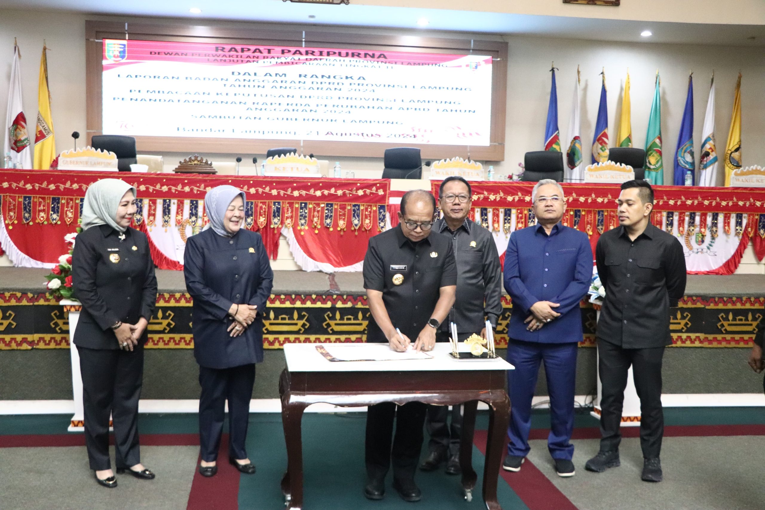 Gubernur Lampung Samsudin bersama Ketua Dewan Perwakilan Rakyat Daerah (DPRD) Provinsi Lampung Mingrum Gumay menandatangani Persetujuan bersama Peraturan Daerah Tentang Perubahan Anggaran Pendapatan dan Belanja Daerah (APBD) Provinsi Lampung Tahun Anggaran 2024, pada Rapat Paripurna Pembicaraan Tingkat II DPRD Provinsi Lampung, bertempat di Ruang Sidang Paripurna DPRD Provinsi Lampung, Rabu (21/08/2024).