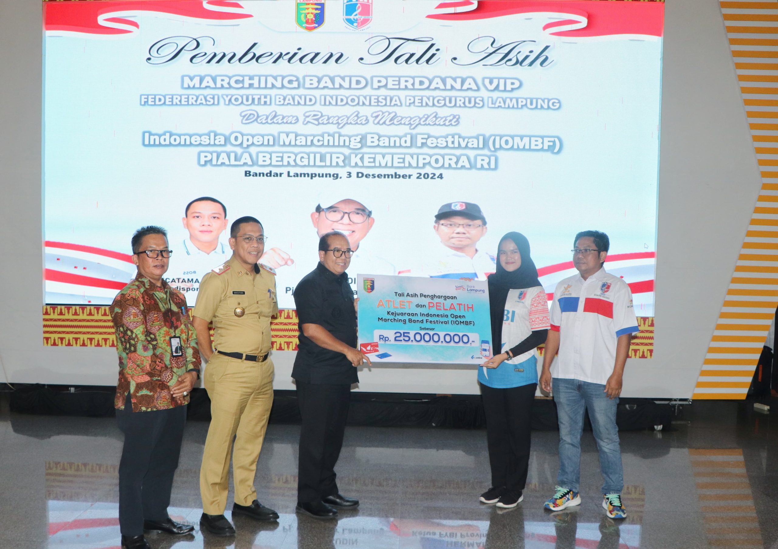 Pj. Gubernur Lampung, Samsudin menyerahkan penghargaan dan tali asih kepada Marching Band Federasi Youth Band Indonesia (FYBI) Pengurus Lampung, di Mahan Agung, Selasa (3/12/2024).