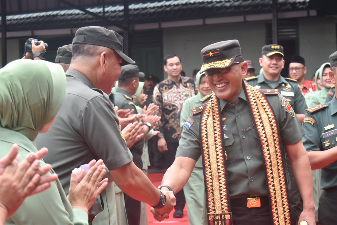 Didampingi Ketua Persit KCK Koorcab Rem 043 PD II/SWJ Ny. Iryani Haryantana, Komandan Korem 043/Garuda Hitam Brigjen TNI Haryantana, S.H., melaksanakan kunjungan kerja perdana ke Kodim 0410/KBL di Jl. Imam Bonjol, Bandar Lampung, Kamis (14/8/2025).