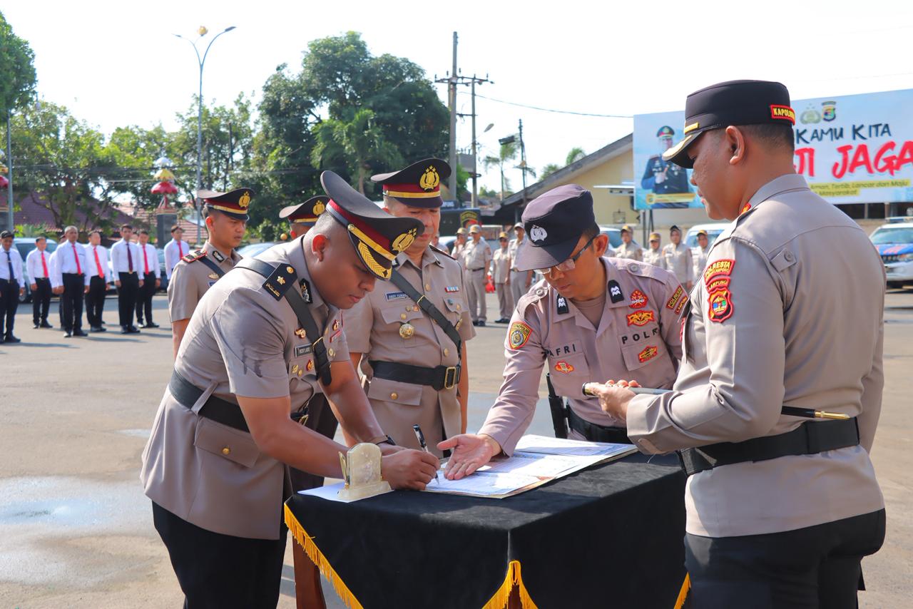 Kapolresta Bandar Lampung, Kombes Pol Alfret Jacob Tilukay, memimpin upacara serah terima jabatan Kasat Intelkam, Kasat Lantas dan Kapolsek Tanjung Senang di lapangan apel Mapolres setempat, Selasa (4/11/2025) pagi.