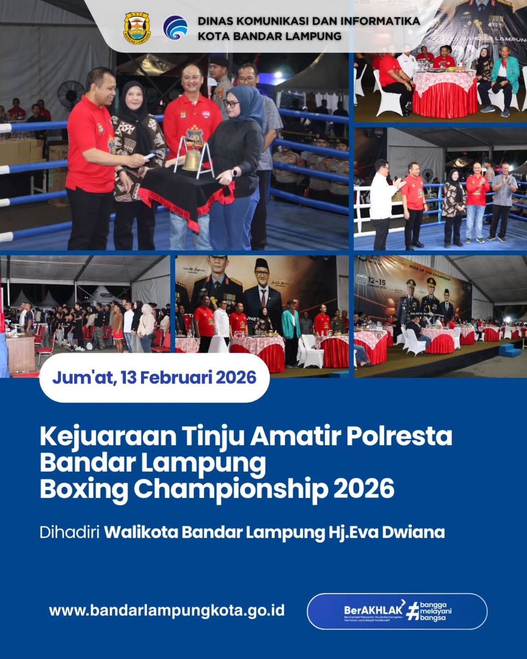 Wali Kota Bandar Lampung, Hj. Eva Dwiana menghadiri Kejuaraan Tinju Amatir Polresta Bandar Lampung Boxing Championship 2026 yang diselenggarakan oleh Polresta Bandar Lampung di Lapangan Mapolresta, Bandar Lampung, Jumat (13/2/2026).