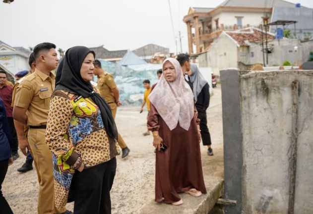Wali Kota Bandar Lampung, Hj. Eva Dwiana melakukan peninjauan aliran sungai dan gorong-gorong yang melintasi Perumahan Pujangga Alam, Labuhan Ratu, Kecamatan Kedaton, Kota Bandar Lampung, pada Selasa (31/3/2025).