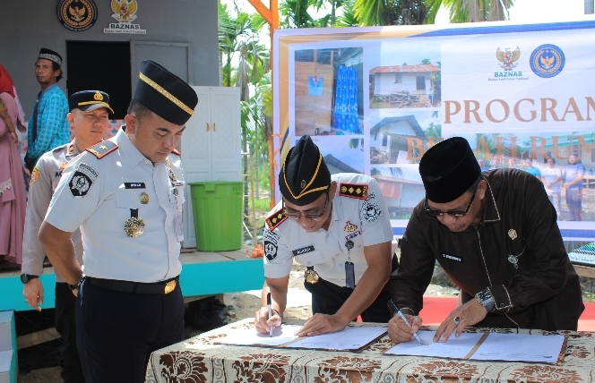 Kepala Kantor Wilayah Direktorat Jenderal Pemasyarakatan Jambi, Irwan Rahmat Gumilar, menghadiri kegiatan Serah Terima Kunci Program Bedah Rumah hasil kolaborasi antara Badan Amil Zakat Nasional (BAZNAS) Kabupaten Tanjung Jabung Timur dan Lapas Narkotika Kelas IIB Muara Sabak. Kegiatan ini menjadi wujud nyata sinergi antar lembaga dalam meningkatkan kesejahteraan masyarakat melalui program sosial berbasis zakat, pada kamis (23/4).
