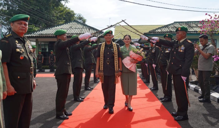 Prajurit dan PNS Korem 043/Garuda Hitam (Gatam) menyambut kedatangan Kolonel Kav Roli Dewanto, S.E., M.Tr.(Han), sebagai calon Kepala Staf Korem (Kasrem) 043/Gatam di Kota Metro, Lampung, dalam sebuah prosesi yang berlangsung khidmat.